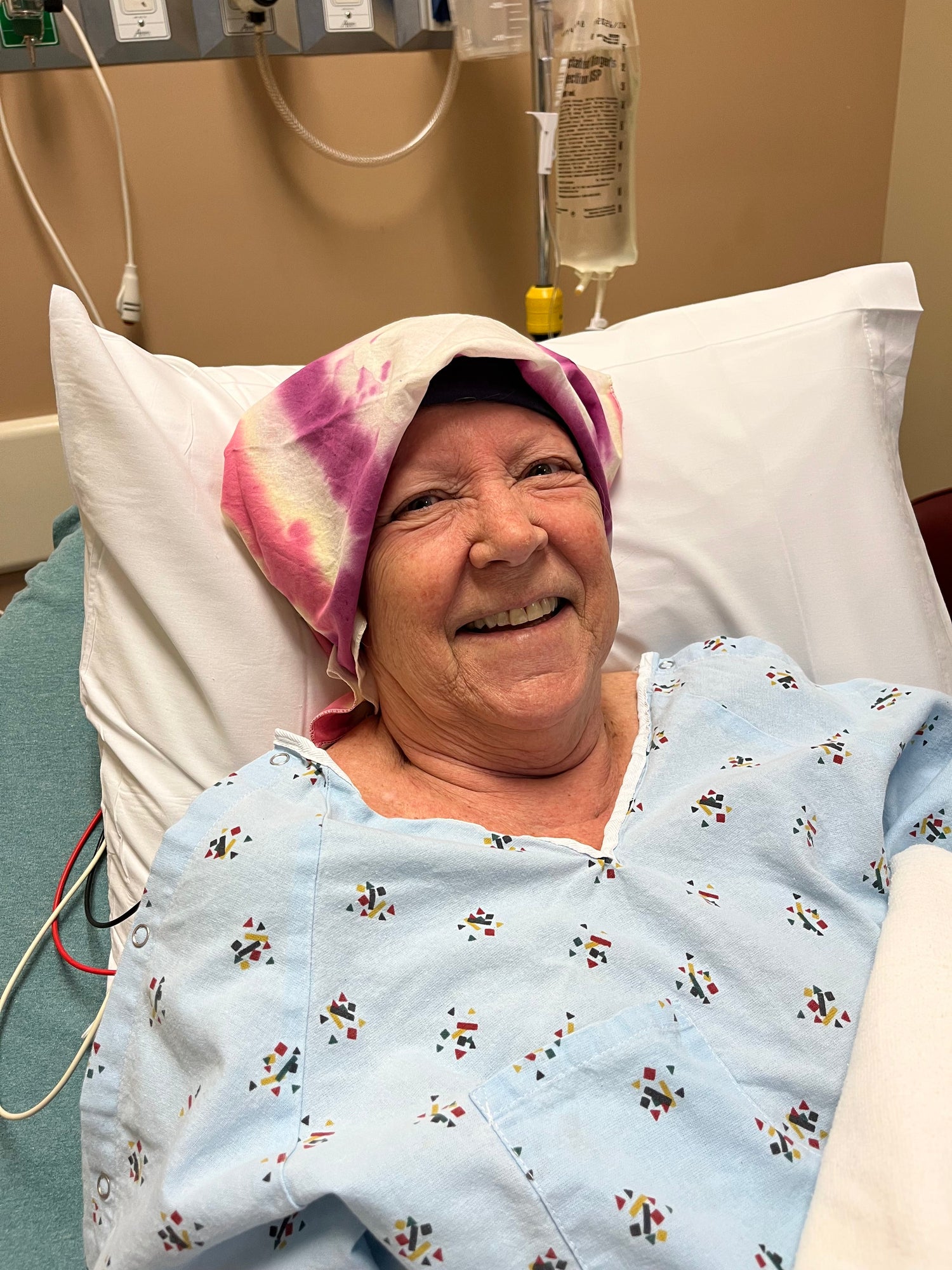 A smiling woman sits in a hospital bed wearing a CureChief bandana. She is undergoing breast cancer treatment but radiates strength and joy. The bandana is tied around her head, representing solidarity, beauty, and courage during her healing journey.