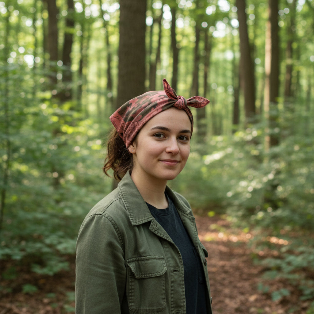 The Wild Grace Bandana from the Grit & Bloom Collection celebrates the balance between resilience and beauty, where nature’s wild edge meets a quiet, unshakable grace. Inspired by the strength of those who persevere with compassion, this design blends soft pink hues with natural camouflage textures and an intricate border of florals, feathers, and branches.